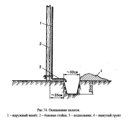 Расправить подпольник палатки; Зимой подпольник обваловать снегом или заранее заготовленным песком; в летнее время подпольник балластом не засыпается, он должен свободно лежать на грунте; если возможен дождь или таяние снега, вокруг палатки следует вырыть канавы для отвода воды (рис.74).